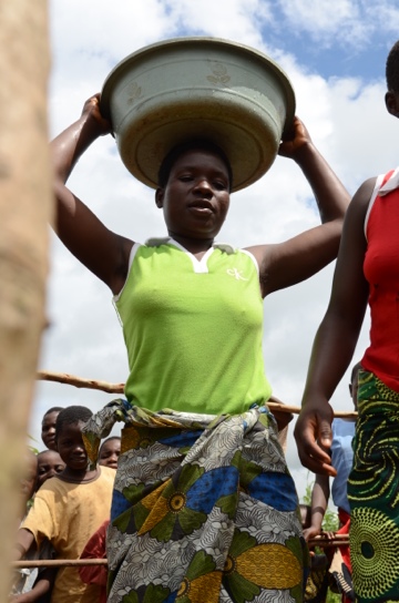 En av kvinnorna som precis har fyllt sitt kärl med vatten och ska gå hem till sig