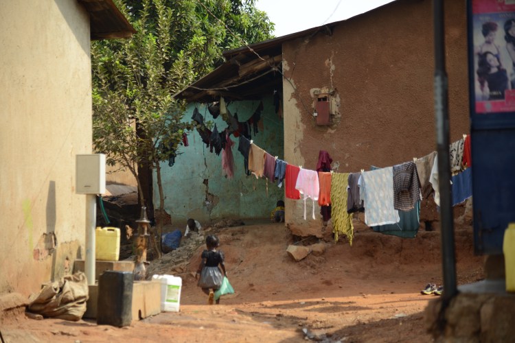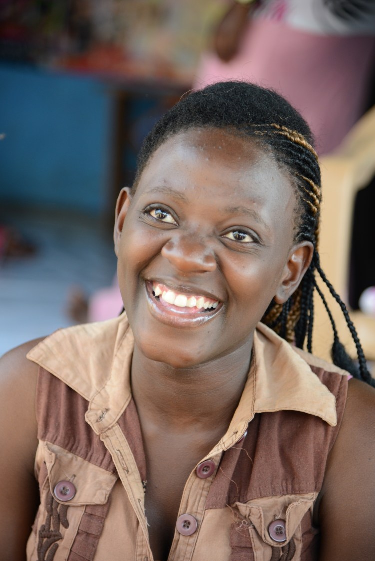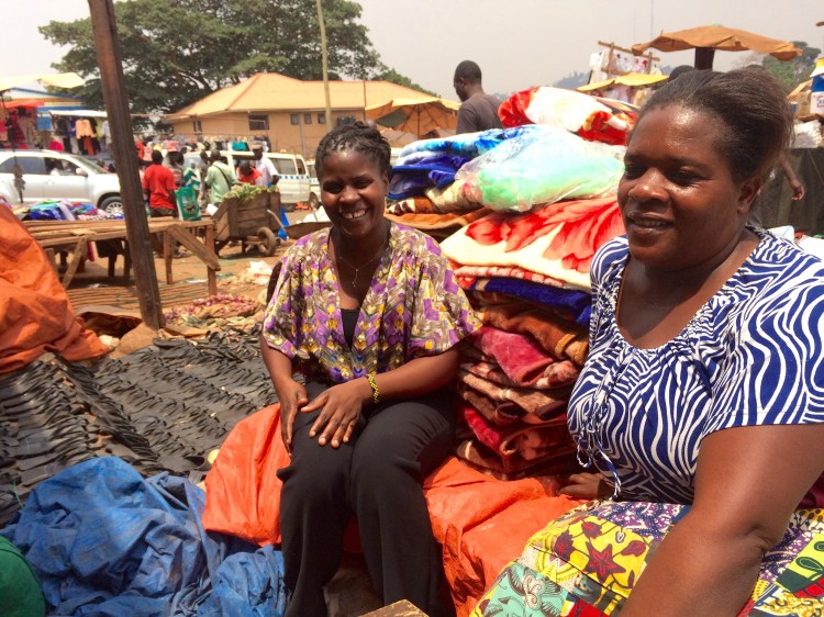 Rose (t.h.) på Nakawa market tillsammans med Grace från KAFOC. Alla filtar och sandaler måste flyttas mellan ett lager och hennes plats varje dag. Hon jobbar ca 10 timmar om dagen 6 dagar i veckan. Har sex barn att ta hand om dessutom.