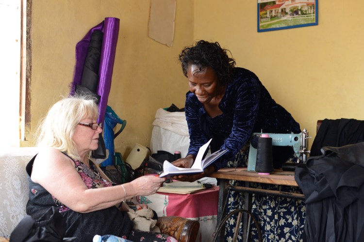 Catherine visar Ulla hennes bokföring för verksamheten med examinationskläderna.