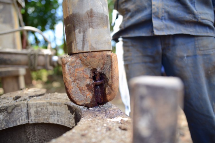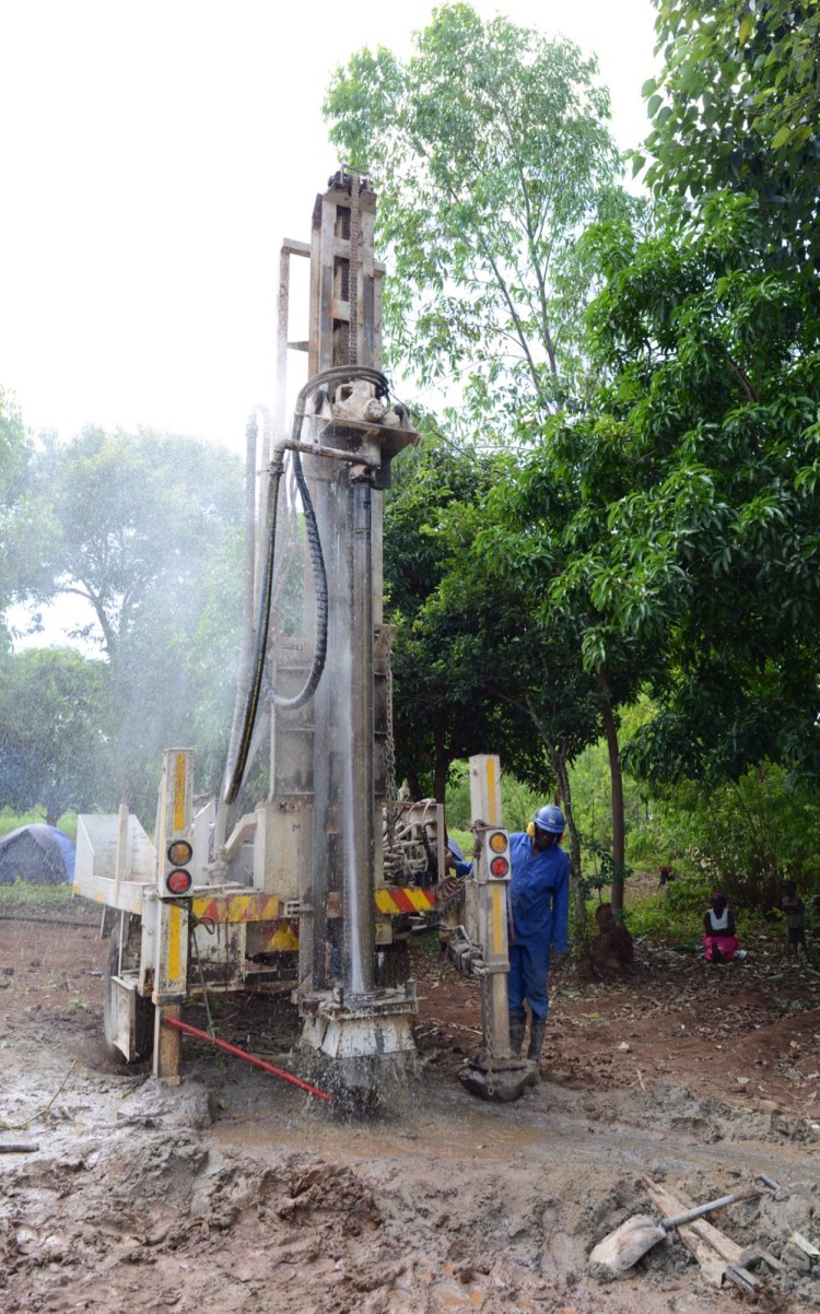 Vi åkte sedan tillbaka till borrningen i Paundi, där vi var igår och där det nu skulle spruta vatten. När vi väl kom dit hade man fått en del problem med casing-rören som skulle göras om, men man hade sparat lite till oss och borrade så att vattnet sprutade upp ur hålet. Faktiskt väldigt glad att de ställde upp på det. Inte så ofta vi får bilder på det.