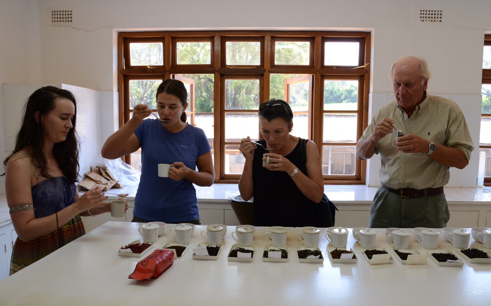 Lördag. Från början hade vi tänkt att ta en promenad idag. Försökte få en guidad tur på en Tea-estate men de skulle ha stängt. Funderade på om vi ändå skulle åka till vattenfallet även om det nog inte är så mycket vatten nu. De kanadensiska tjejerna lyckades få tag på en Tea-estate i Thyolo, ca 1 timme bort, så vi bokade vår chaufför för det och tjejerna hängde på. Medan vi väntade tittade vi på herdar som vaktade getter, kvinnor som bar tunga vedhögar, med mera. Väldigt trevligt besök på teodlingen där vi fick se en film över hur teet odlas (och de olika stegen tills det teet är färdigt) och fick sedan prova 15 olika sorter som alla kom från samma typ av blad och från deras område. Så många olika färger och smaker. Väldigt intressant. Åt även lunch där i en byggnad som inte såg så märkvärdig ut på utsidan, men fantastiska rum på insidan. Ett av de äldsta teodlingsområden i Malawi, Satemwa.