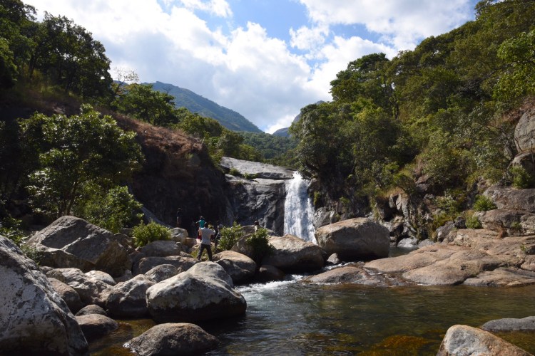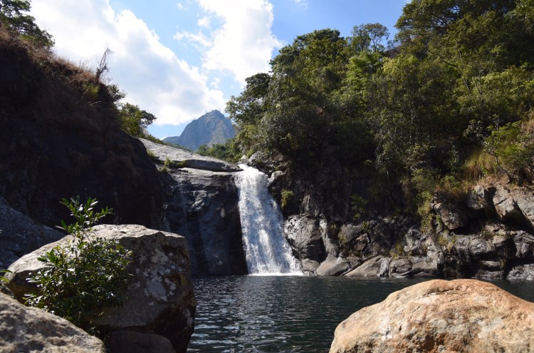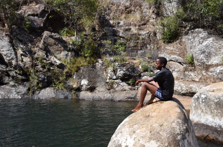 Den andra önskningen var att åka till Likhubula Falls, som är ett vattenfall 30-45 minuters vandring från centret där många av vandringarna i området utgår ifrån. Dit åkte vi efter att ha varit på kontoret. Här rådde en helt annat aktivitet jämförelsevis med Mulanje by och de bergsguider som finns vid infocenter ovanför pizzerian. I Likhubula är det en oerhört vacker natur, många kvinnor som bar tunga trä-lass och ett väldigt vackert vattenfall med bergen i bakgrunden. Vi var först där ett tag innan andra kom. Några afrikanska ungdomar som var i närheten, badade också i poolen som bildats nedanför fallet. Guiden berättade att för någon/några månader sedan var vattennivån flera meter högre. Tror vi kom vid en väldigt bra tidpunkt. Hoppade över att gå till den nedre poolen. Tror att Lawrence var rätt tröttkörd efter vandringen upp till fallet.