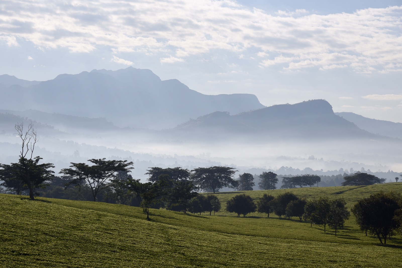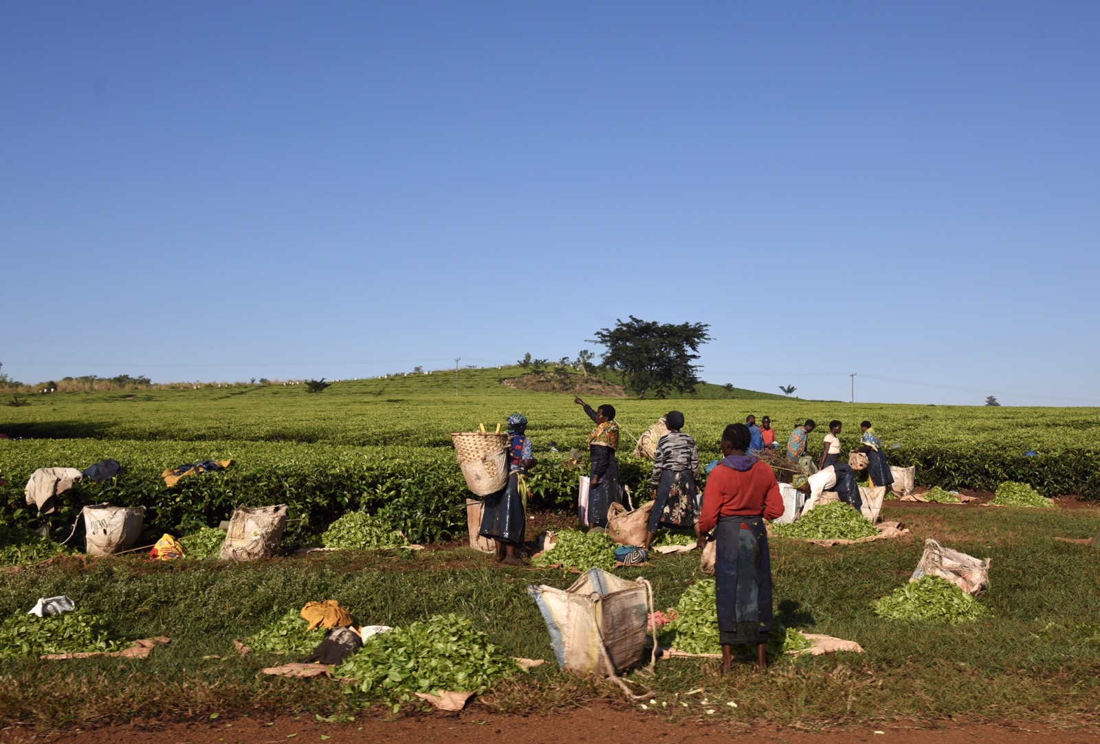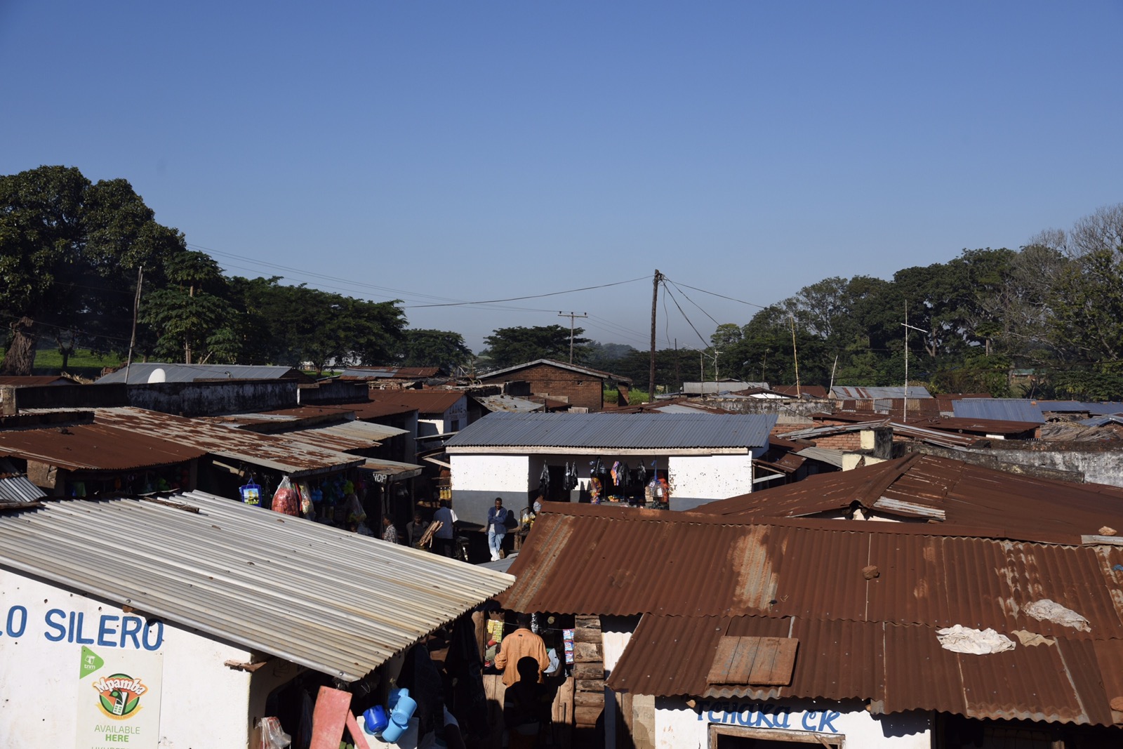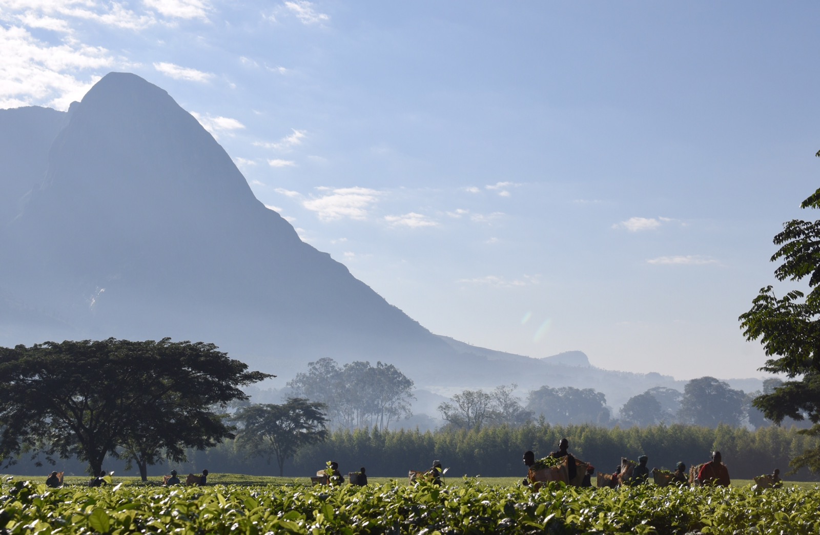 Idag vart det en annan dag än normala besök ute i byar. ADRA Malawi jobbar dessutom bara halvdag på fredagar, så det passade bra att göra ett alternativt program. Morgonen var väldigt vacker med dimslöjor över stora delar av slätten. Jag hade två önskningar för dagen. Den första var att hitta te-plockare och helst få någon bild med bergen i bakgrunden. Jag hade tänkt mig området kring Lujeri, där jag varit förut, men jag tror inte de andra var så sugna på att åka ända dit, så vi sökte i närheten istället och hittade nog rätt bra alternativ. Försökte hålla oss i bilen och på lite håll för att inte behöva ge ut en massa pengar. Sökte igenom ett par områden. Efter vi varit där åkte vi tillbaka till kontoret där Laston behövde hämta en extra batteri till hans telefon. Passerade även det fattigare området längs vägen.
