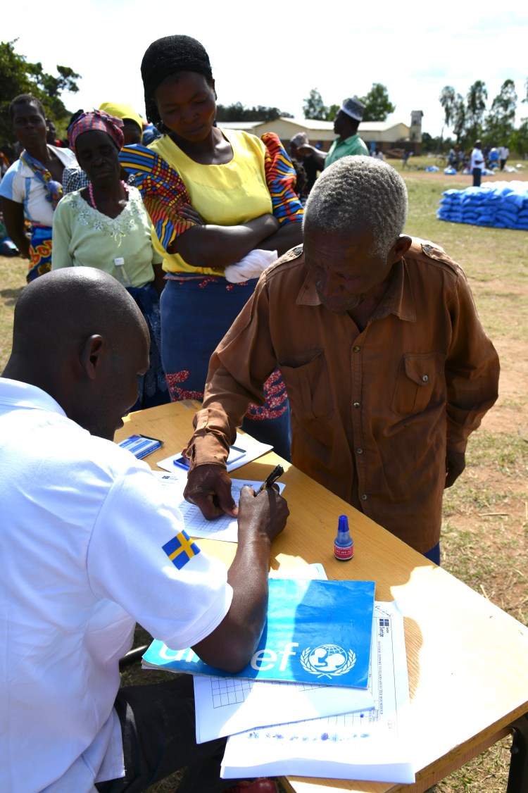 Vi åkte sedan ut till ett matutdelningsställe, där ADRA förmedlade Ris, Soya påsar med olika smak samt ”Pigeon Pease” till de familjer de valt ut genom att själva gjort urvalet på plats. Intressant att se hur det gick till och Karin prövade att bära 2 rissäckar för en av mottagarna och fick en känsla för hur tungt det var.