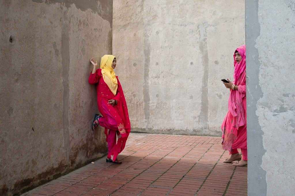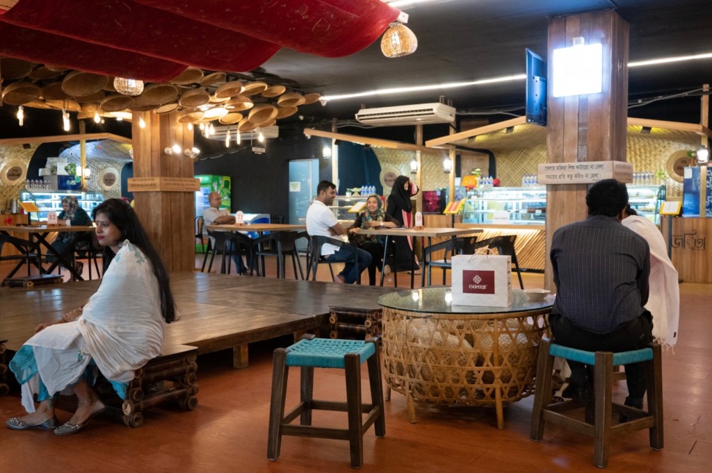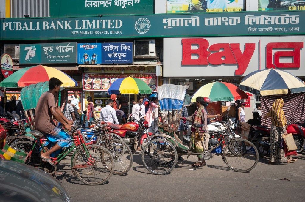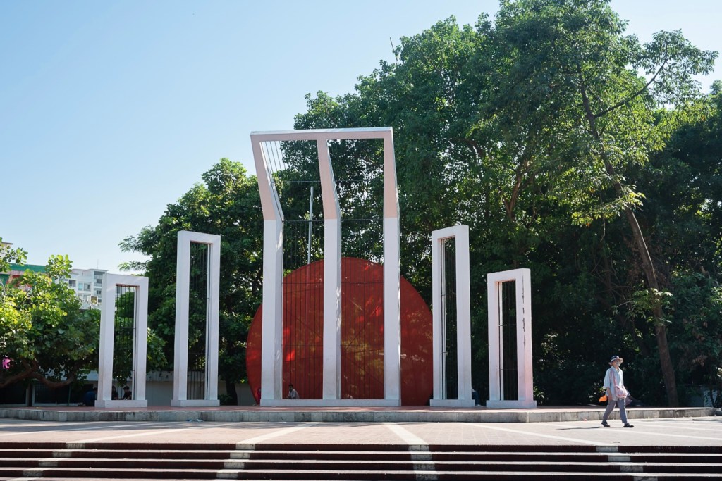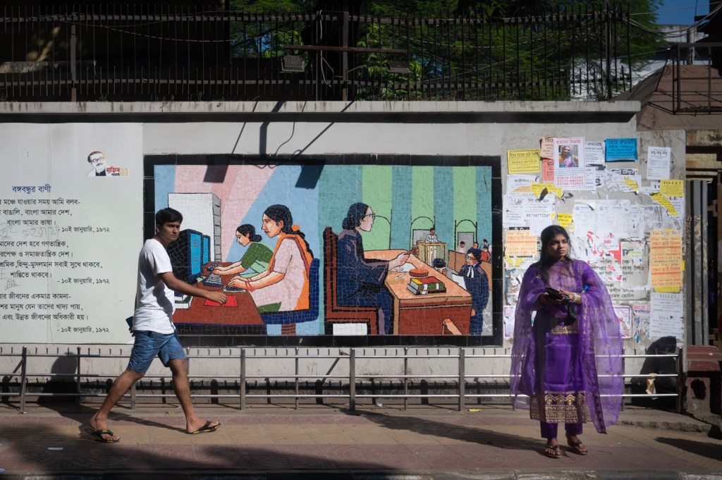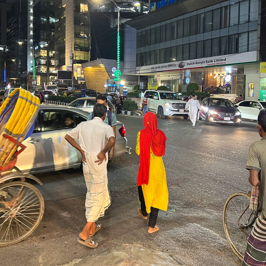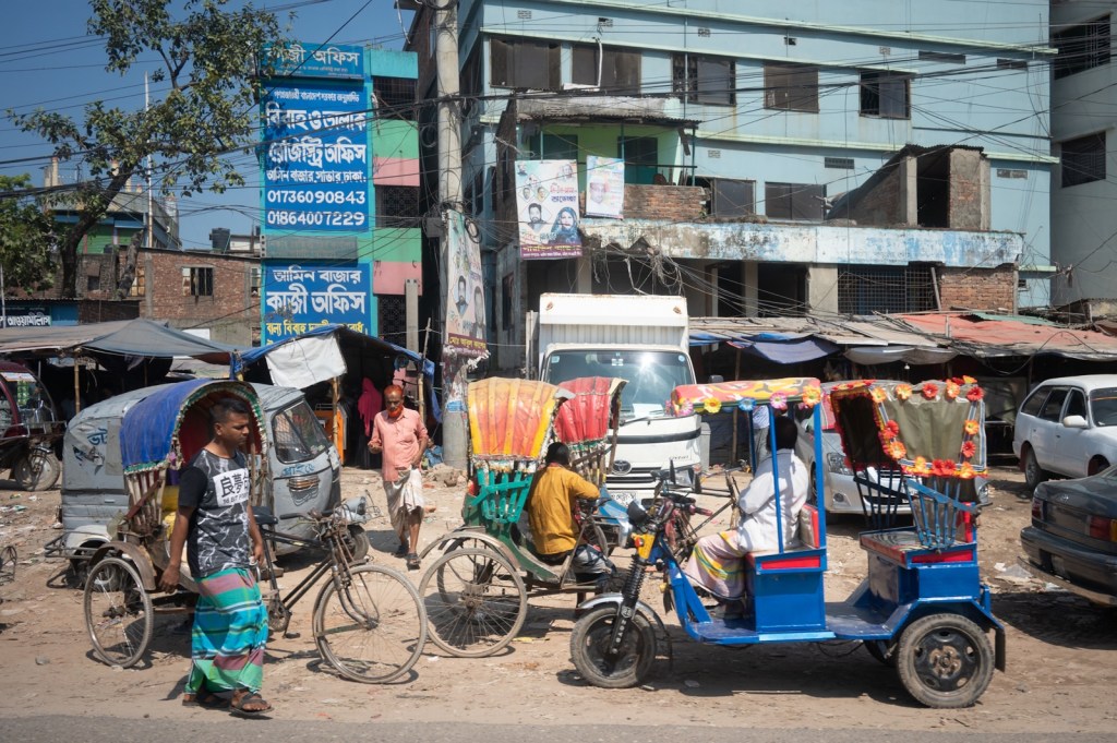 En gatubild relativt nära det hotellet där vi borEn bor över Buriganga River, på väg mot det nationella monumentet över Bangladesh martyrerEtt häftigt monument i betong, som bestod av 7 trianglar (sju stora händelser innan man blev självständiga. Mycket som händer längs vägarna där olika typer av fordon blandas. Inte helt olikt Afrika faktiskt. Över floden igen, samt att jag satt på rätt sida och bad chauffören åka i filen närmast floden (han stannade till och med…)Väl in mot Dhaka igen så hade trafiken tätnat rejält. Många är lediga på lördagar och vill också in till stan. Undrar om bygghjälmen på passageraren ger ett bra skydd på motorcykeln?Ett måste är så klart att även åka förbi parlamentet. Annorlunda men rätt häftig byggnad. Reem hade ett tips på var vi kunde äta lunch. Här försöker hon förklara för chauffören vart det ligger.Ett ställe med många olika rätter som är vanliga i Dhaka. Dessutom hade de en hel del hantverk att titta på i anslutning till restaurangen.Jag skulle inte vilja jobba som teletekniker här i Dhaka (i går fick vi förklarat att det var väldigt jobbigt att leta fel, vilket är lätt att förstå).Eftermiddagen gick åt till att sitta i köer, titta på allt runt om kring, men även att besöka ”new market” än marknadsplats som är mer avskild från gatularmet. Väldigt vanligt med både cykel-rikshor och tuk-tuksKring universitetet ligger monumentet ”Saheed Minar” till minne av de som dödades under ”Bangali Language Movement” då de krävde att Bengali skulle få vara ett officiellt språk i landet (då Öst-Pakistan). Många studenter drev denna kamp. Monumentet har förstörts vid olika tillfällen och detta är det senaste, som är skapat av Bangladeshier och en dansk arkitekt. Idag ett av de viktigaste monumenten i Bangladesh.Några universitetsbyggnader var designade på detta sätt, bland annat för utbildningar inom fysik och medicinsk bioteknik.