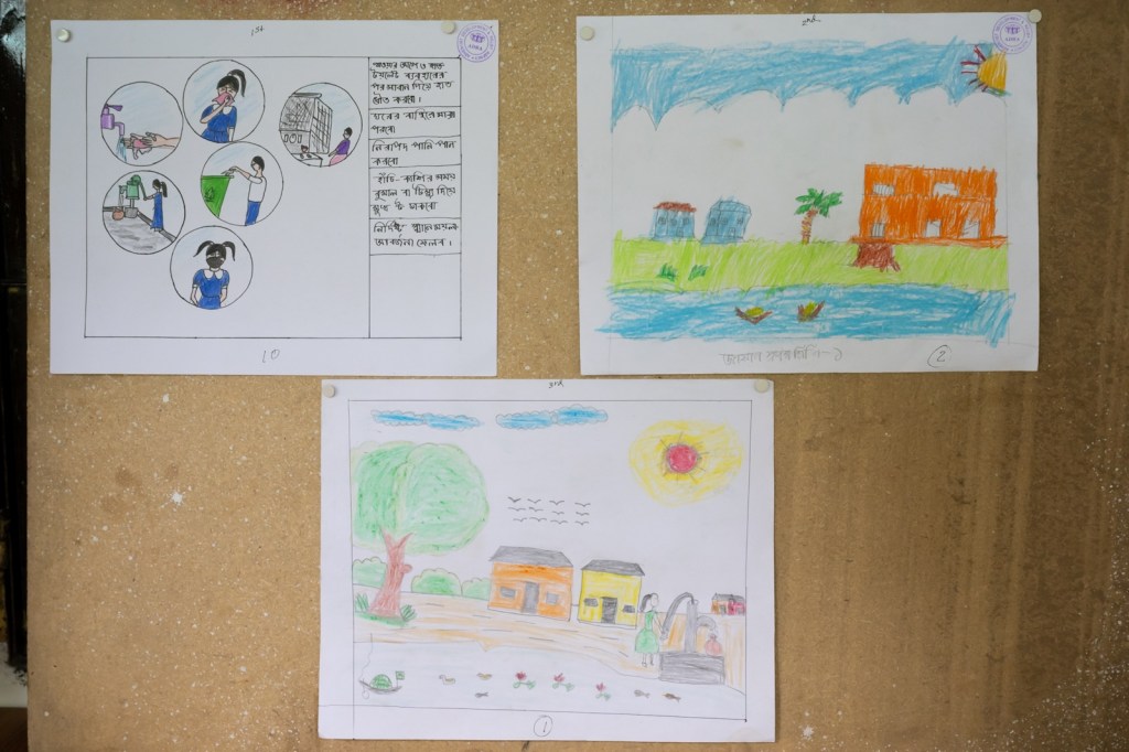 Längs vägen till ManikganjJoel, ansvarig för kontoret i Manikganj hälsar oss välkomna!Hela personalen är samlad och sjunger en välkomstsångDe hade tagit bilder på oss under de första dagarna (utan att vi visste om det) och gjort en välkomstplansch som de hade hängt upp där samlingen var. De hade haft en dag då de pratat om WASH i skolor. Eleverna hade fått i uppdrag att teckna hur de såg på WASH. Här är tre av de många ritningarna. Primärskolans elever tyckte det var roligt att få besök av oss