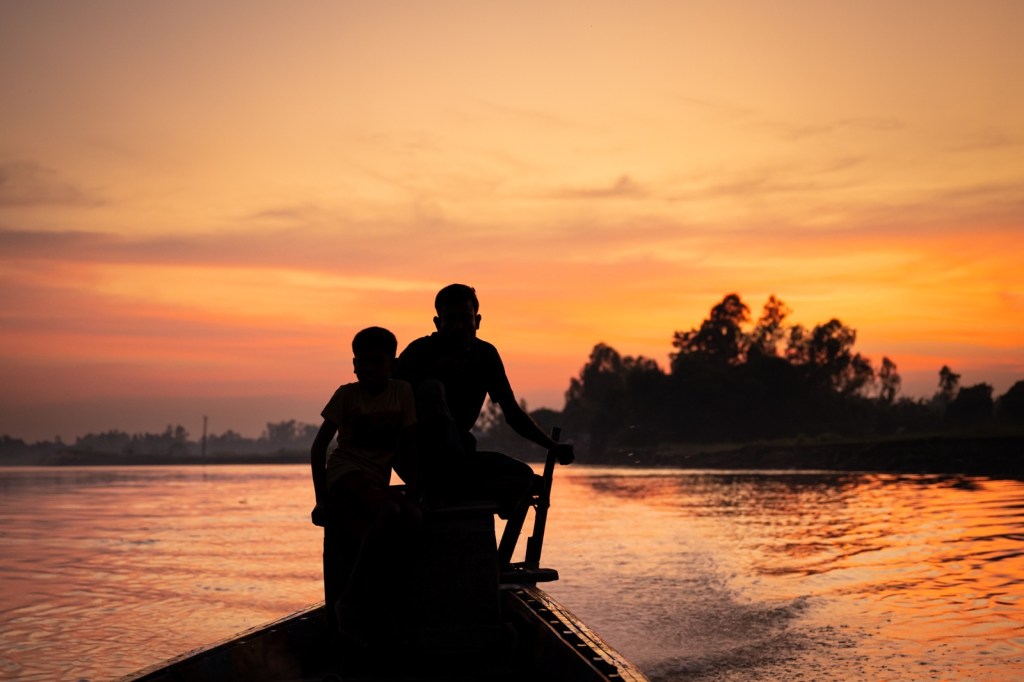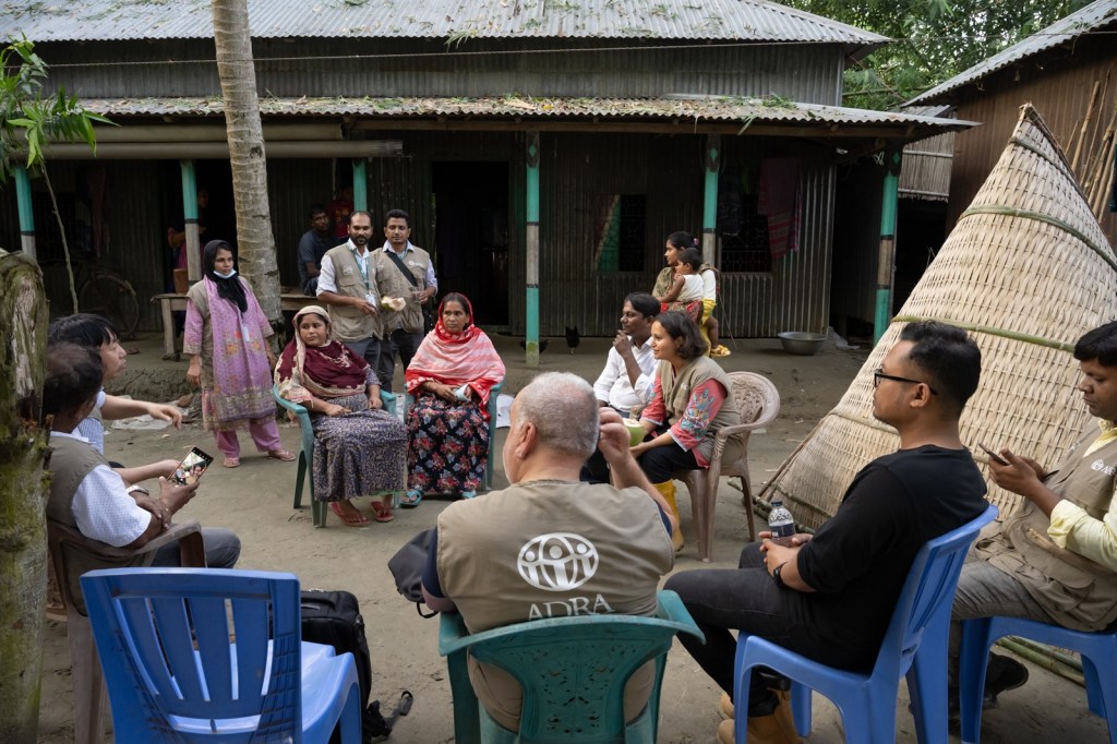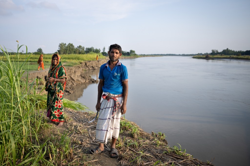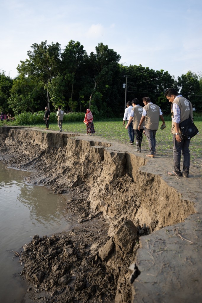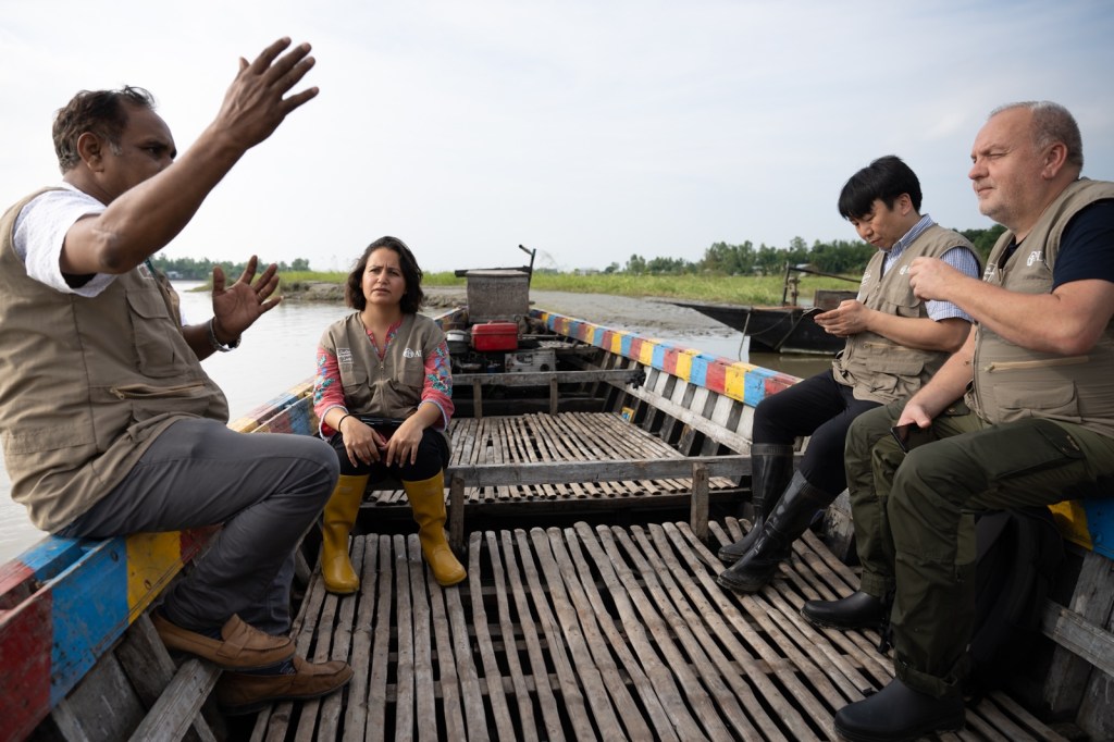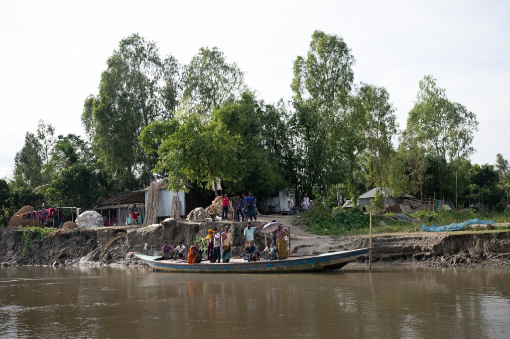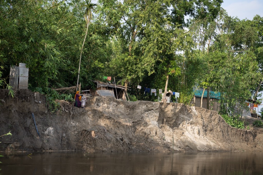 Sonen som fick hjälpa hans pappa med att sköta och köra båten vi åkte med. Joel hade många berättelse från området, dit han kom för 15 år sedan. Här kunde man se stora effekter av landerosionen kring vattnet. Mer och mer land försvinner ned i vattnet varje år och människorna måste hela tiden överväga att flytta eller inte. Samtidigt vill de bo nära vattnet, kanske för att det mest är den verkligheten de känner till Vi brukar ofta prata om vilket avstånd latriner (längst till vänster) ska vara långt ifrån vatten, men hur gör man när det bara är vatten runt omkring och att det försvinner land. För mig en nyhet och ännu en olöst fråga. Vi steg av båten för att träffa några bybor. Var rejält lerigt, framförallt närmare mer fast land, som inte syns här. Här var det fortfarande frid och fröjd. Nästa stopp på andra sidan floden och en familj som ingick i ADRAs Community Based Organisation (CBO). Detta par hade dock inte med att göra, men levde också längs floden. Delar av kanten satt löst och delar av stigen hade redan rasat ned. Möten och diskussioner kring hur allting var och är…Familjeöverhuvudet. Fick även stifta bekantskap med kolfilter och vattenrening, framförallt för att bli av med järnsmaken på vattnet. En idé från Joel som påminner mycket om annan vattenrening i hushållet. På vägen tillbaka visade Joel hur det såg ut för 4 månader sedan när de åkte motorcykel mellan byarna på den torrlagda flodbädden. Vi fick även se solnedgången från vattnet. En mäktig himmel med härliga färger blev det ocksåTillbaka på land och på väg till bilen. Härefter åkte vi till hotellet, nästan en timme bort, som låg där Brahmaputra och Padma (Ganges) går ihop och fortsätter söderut.