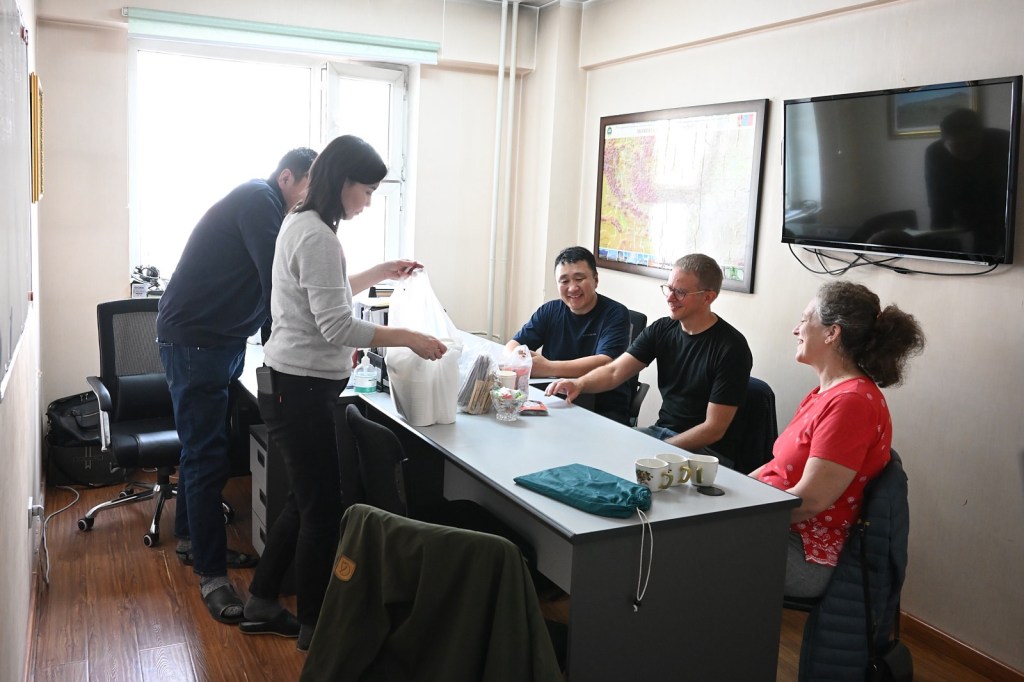 Turkhuu var beredd och kände väl igen Jenny. Glatt återseende. Ny flygplats och ny väg in mot UB kändes bra. Fascinerande landskap med stäpp, kullar, hästar och gers. In mot UB steg röken framförallt från en del kraftverk som låg inne i stan. Här blev det mycket trafik och det gick väldigt långsamt framåt. Tålamodsprövande. Åkte igenom centrum då hotellet inte ligger så långt i från. Patrik väntade på oss på hotellet och vi tog en gemensam promenad ned till centrum och tillbaka. Många personer med traditionella dräkter. Avslutningsceremonier i skolan var nog anledningen och många gånger klär föräldrar upp sig på motsvarande sätt som eleverna. Häftiga kläder i alla fall. Tog lunch på hotellet (Japansk restaurang) och gick sedan tillsammans med Turkhuu till deras kontor, mer eller mindre en lägenhet i ett lägenhetskomplex. 4 personer jobbar på kontoret, totalt är de ca 17st runt om i landet.