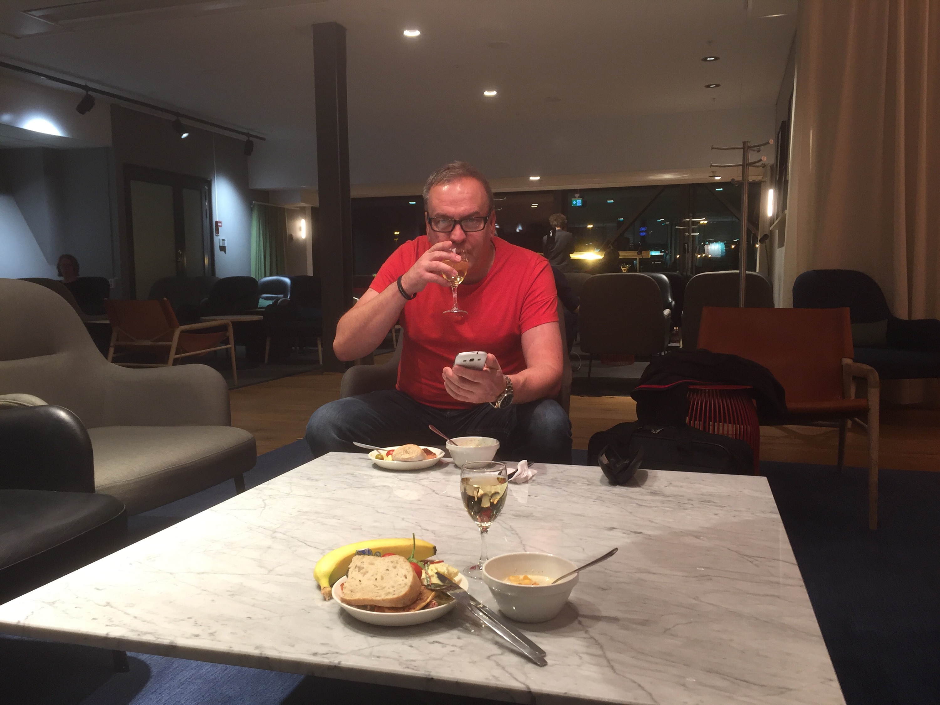 Checkade in våra väskor på business (”=kul med guldkort”) och tog oss till loungen där vi tog oss lite mat medan vi väntade på Hans och Per. De kom någon halvtimme efter oss. Det var roligt att träffas, alla upprymda över vad som skett och med stora förväntningar på resa.